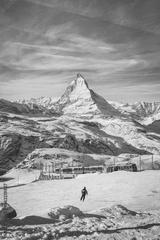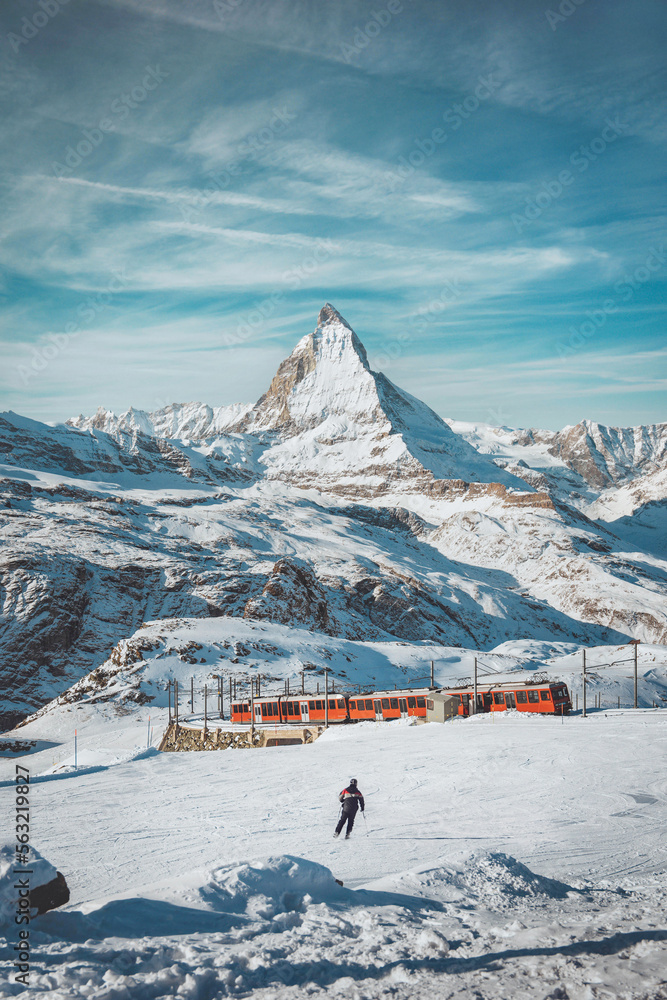 Matterhorn, Switzerland, Winter tourist train and male skier skiing with Matterhorn mountain in the background, Zermatt