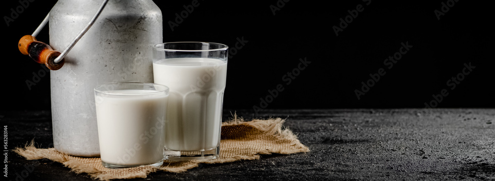 Rustic milk in a can and a glass on the table.