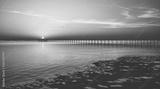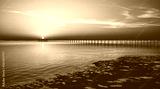 Seascape with a wooden pier silhouette at sunset, color toning applied.