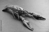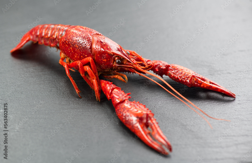 Crayfish, Crawfish closeup. Red boiled one river crayfish on stone slate dark background. Lobster closeup. Detailed photoю