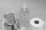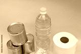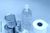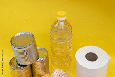 Donations food with canned food on yellow background, canned goods and dry food non perishable with cooking oil, donate concept,