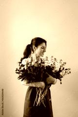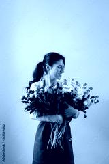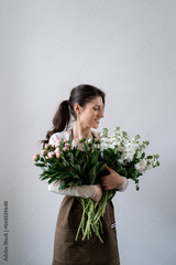 WOMAN florist EMBRACING a bunch of white and pink flowers on white background indoors
