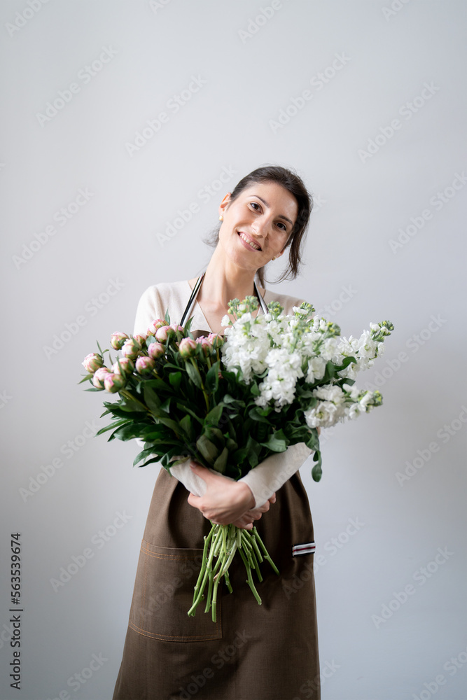 WOMAN florist EMBRACING a bunch of white and pink flowers on white background indoors