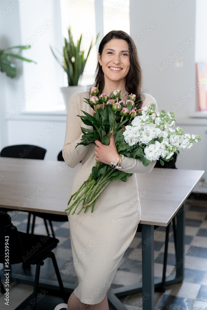 Positive woman holding a huge bouquet of flowers in her office. Birthday present smile.