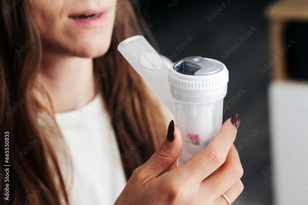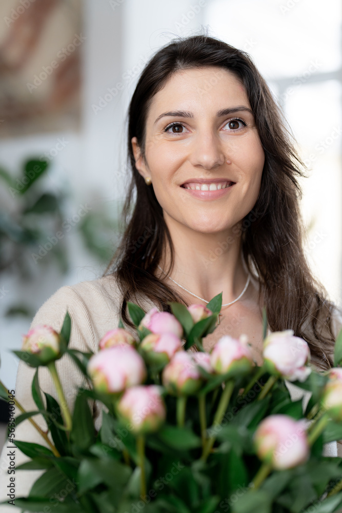 Positive woman holding a huge bouquet of flowers in her office. Birthday present smile.