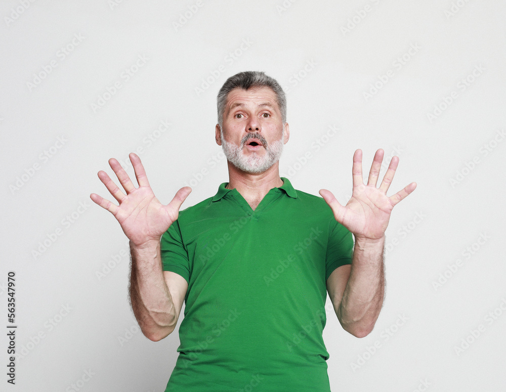 portrait senior bearded man, looking shocked, scared trying to protect himself in anticipation of unpleasant situation