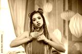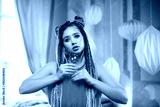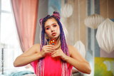 young woman with dreadlocks hairstyle wearing pink dress, doll style, bright make, up in the pink room.
