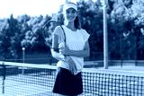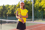 Pretty sportswoman with racquet at the tennis court. Healthy lifestyle.