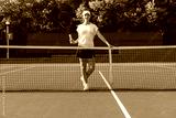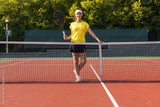 Pretty sportswoman with racquet at the tennis court. Healthy lifestyle.