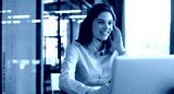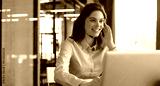 Female customer support operator with headset and smiling.