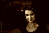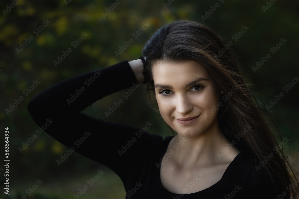 Portrait of attractive young woman posing outdoors in autumn. Horizontally.