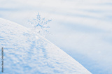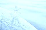 Beautiful ice crystal lies in the snow and glistens in the sun, bokeh in the blue background