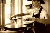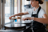 Portrait woman chef baking pancakes in an apron uniform. Fast food service of the city. fast food restaurant is a small business.