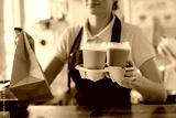 Buying fast food. A pancake with filling and a paper cup with coffee in the hands of a woman seller and a customer in the cafeteria. Takeaway food.