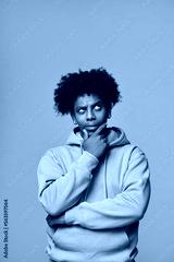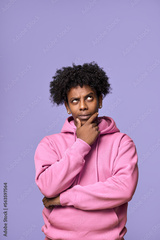 Young thoughtful confused African American teen guy student thinking holding hand on chin, looking up, choosing, making decision, feeling doubt, having question isolated on purple background.