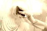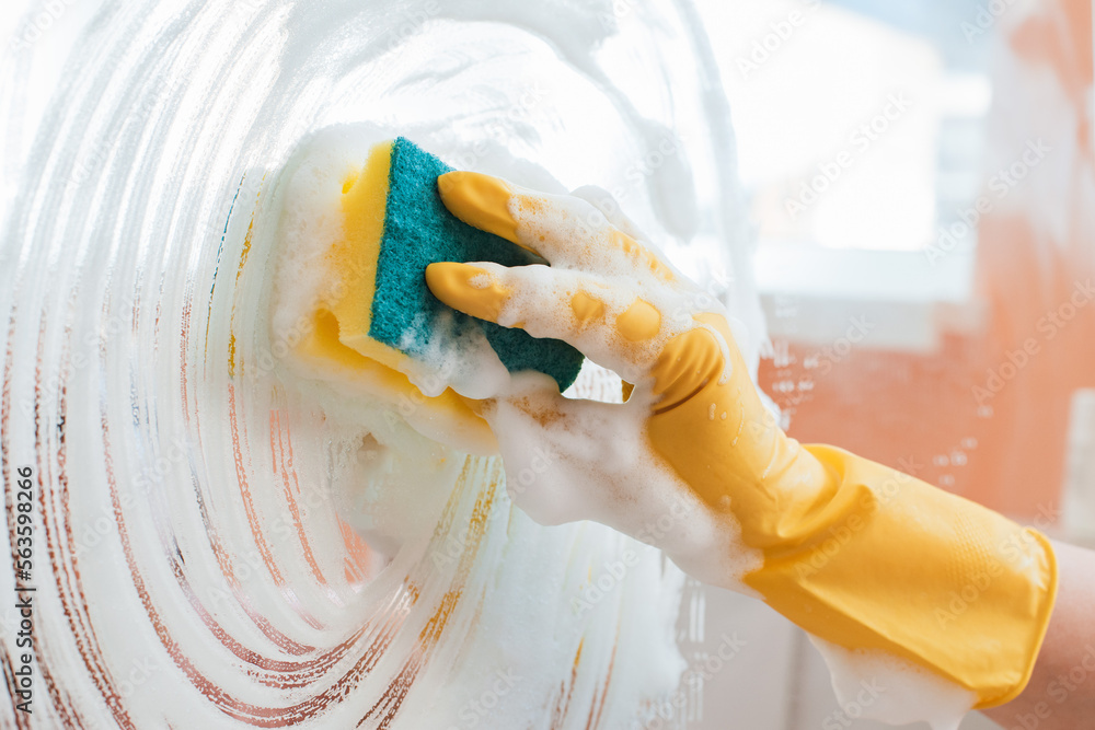 woman does household chores at home, washing the surfaces of mirrors and windows with a spray of detergent with a foam sponge.