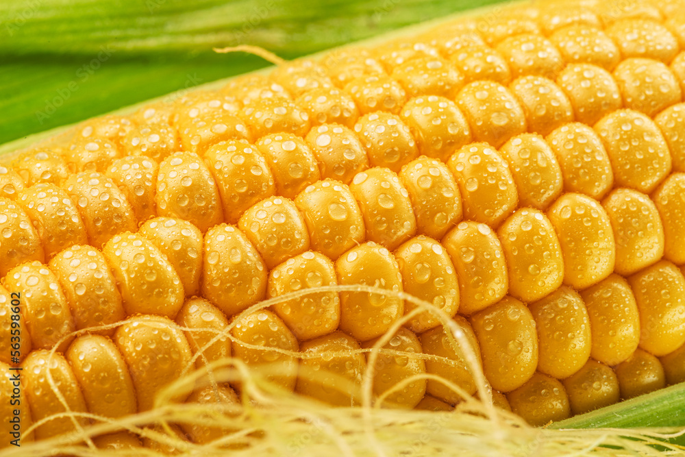 Maize cob or corn cob and maize corn silk close up. Macro shot.