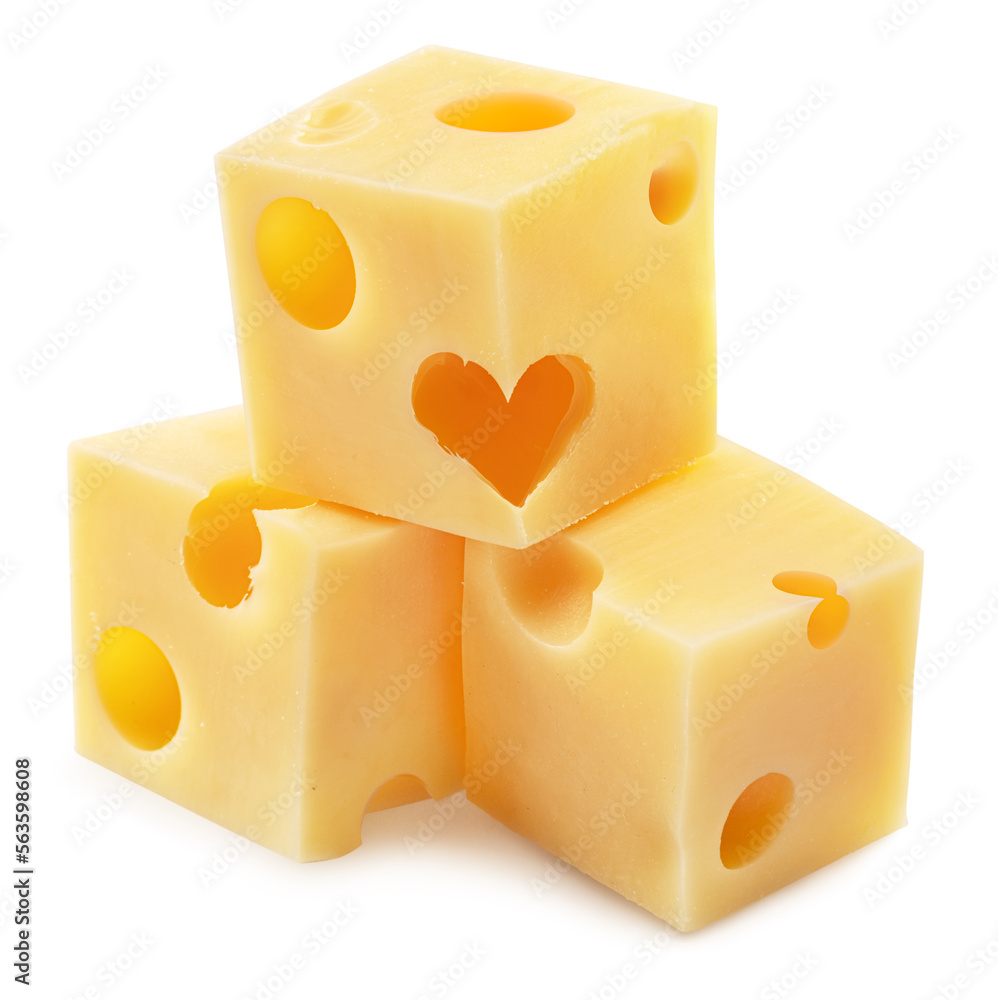 Pyramid of Emmental cheese cubes isolated on white background. File contains clipping path.
