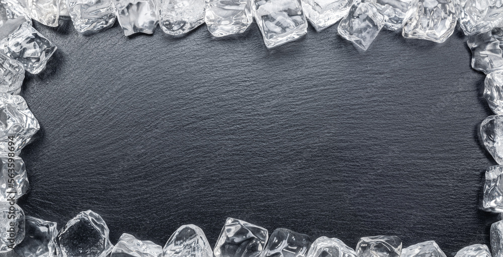 Natural stone black slate serving plate with ice cubes arranged as a frame. Flat lay.