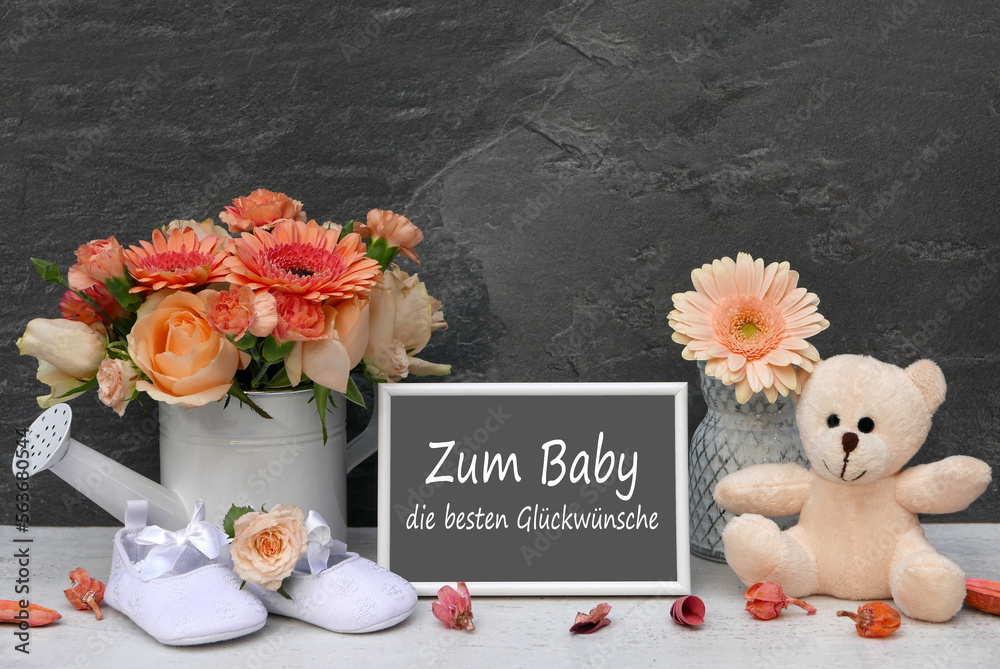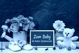 .Herzlichen Glückwunsch zum Baby mit Teddybär, Babyschuhen und Blumenstrauß.