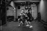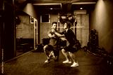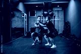 A male instructor assists women in a special suit for EMS technology while performing stability squats in a modern gym concept. Revolution in training, body rehabilitation