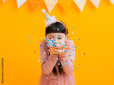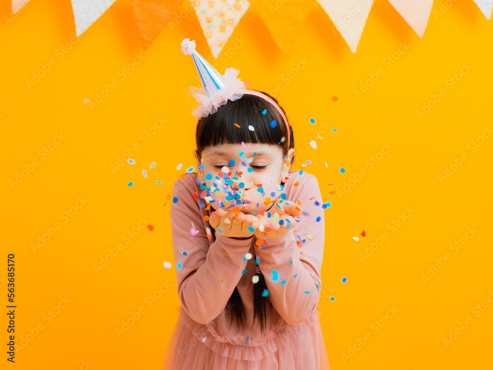 happy birthday children girls with confetti on colored yellow background