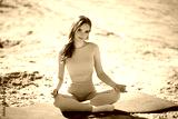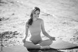 cute caucasian young woman in tracksuit in lotus position near the sea