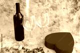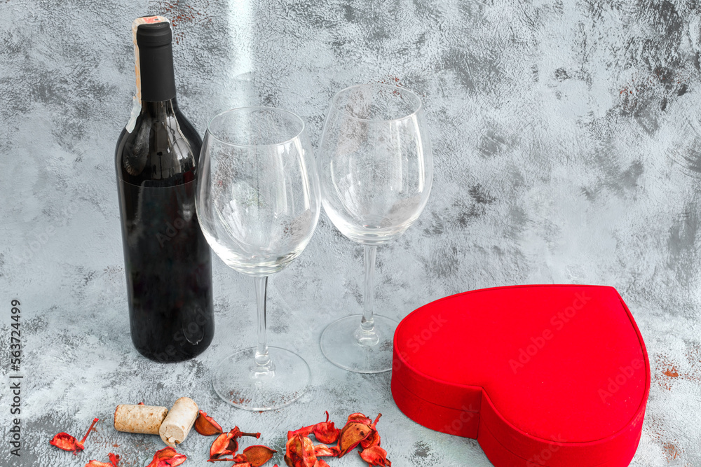 Valentine's Day (February 14 or fourteen) ingredients: Red wine bottle, two wine glass, red heart shaped box gift and dry rose leaves. Side or profile view.