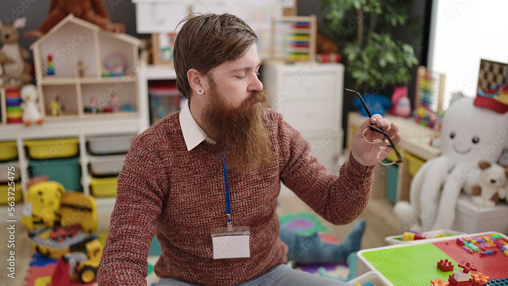 Young redhead man preschool teacher stressed sitting on chair at kindergarten