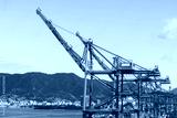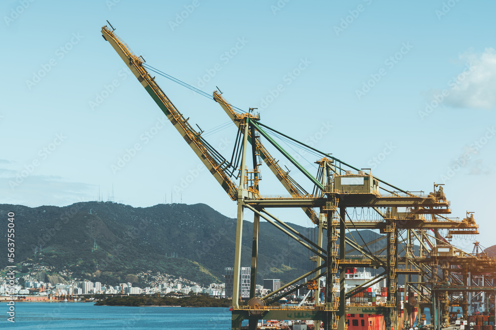 Close-up view of a huge heavy harbor crane in front of the beautiful blue seawater, with long cables, and passages with fences on its top; a copy space area on the right