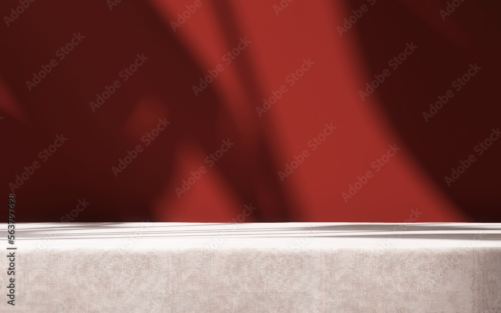 Table countertop, rose pink velvet tablecloth in sunlight, tropical leaf shadow on blank maroon red wall in background for luxury food, beverage, nature, organic beauty cosmetic product display 3D
