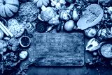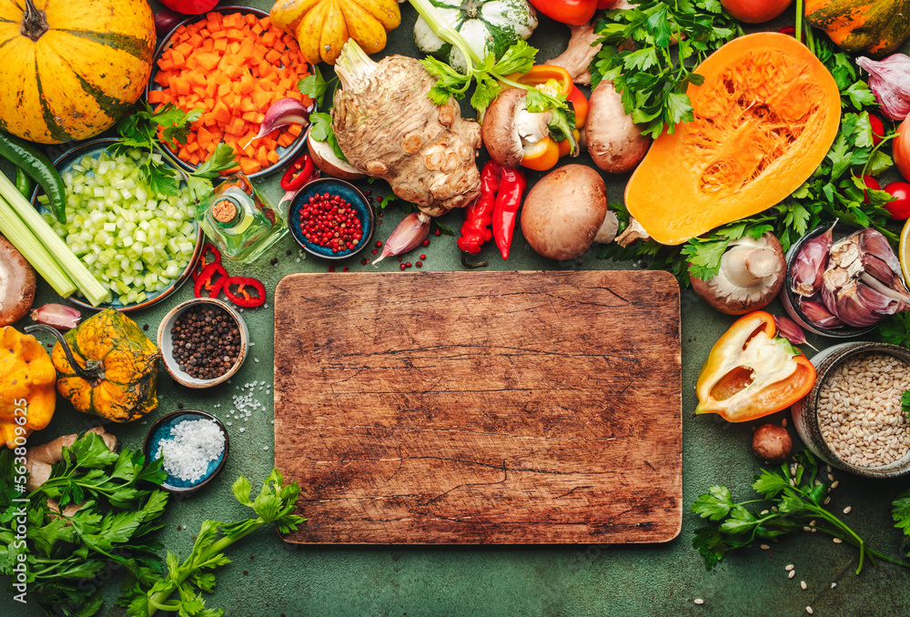 Food background. Rustic wooden cutting board. Vegetables, mushrooms, roots, spices - ingredients for vegan cooking. Healthy eating, diet, comfort slow food. concept. Old kitchen table, top view