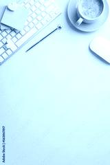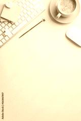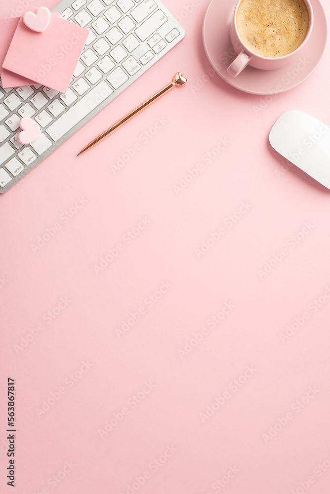8-march concept. Top view vertical photo of keyboard computer mouse stylish golden pen hearts sticky note paper and cup of coffee on saucer on isolated pastel pink background with copyspace