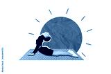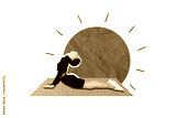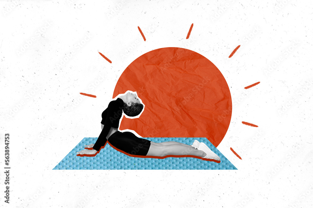 Creative photo 3d collage artwork poster of young girl practicing morning yoga exercises isolated on painting background