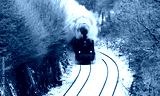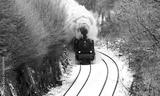 Steam train in winter season on the “Ruhrtalbahn“ (Ruhr valley line) between Arnsberg and Winterberg Sauerland Germany. Black and white vintage with white puff of smoke in picturesque rural scenery.