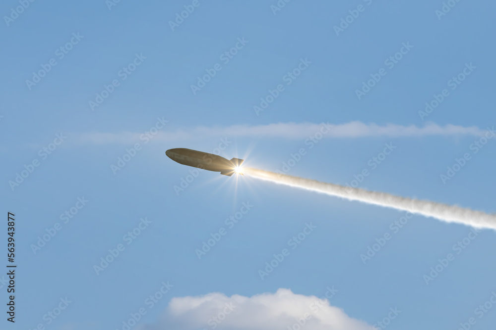 Combat rocket flies in the sky, smoke and fire. Concept: missile attack, air raid, war in Ukraine, air attack.