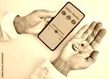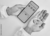 Doctor audiologist showing smartphone app for adjusting hearing aid holding smartphone in one hand and BTE hearing aid in other. Manage hearing aid settings via smartphone