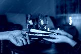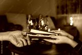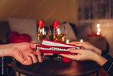 Red gift box with pearl necklace. Valentines Day couple exchanging presents during romantic dinner celebrating at home.