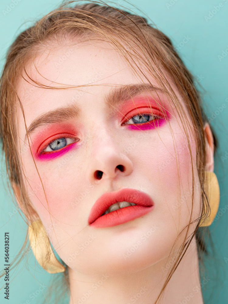 Young adult girl with clear healthy skin wearing bright and colourful makeup. Summer makeup inspiration. Smokey eyes technique. Professional makeup artist occupation.