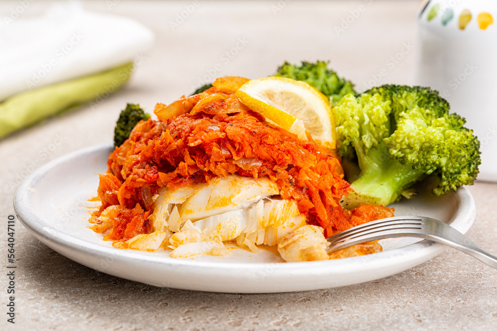 Greek and Polish style oven baked cod fish Psari Plaki with sauteed, shredded vegetables, carrot, onion and tomato sauce. Broccoli. White plate.