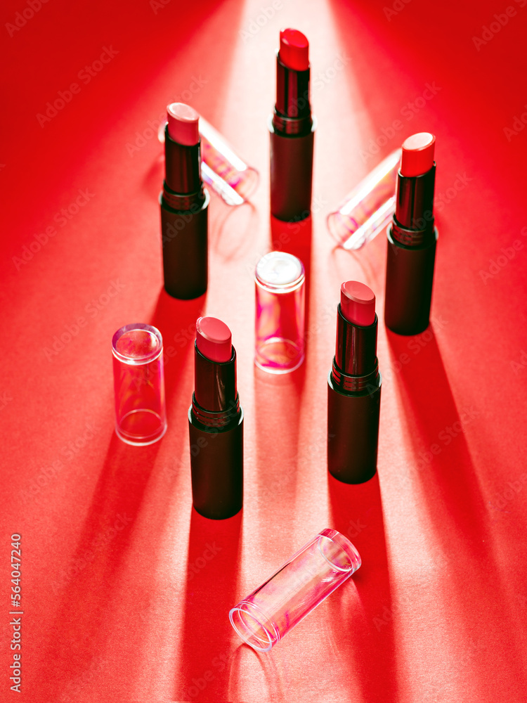 Beautiful set of bold lipsticks in red pink shades. Luxury lipstick samples. High End makeup industry, fashion trends in cosmetics, modern female concept. Professional makeup and beauty.