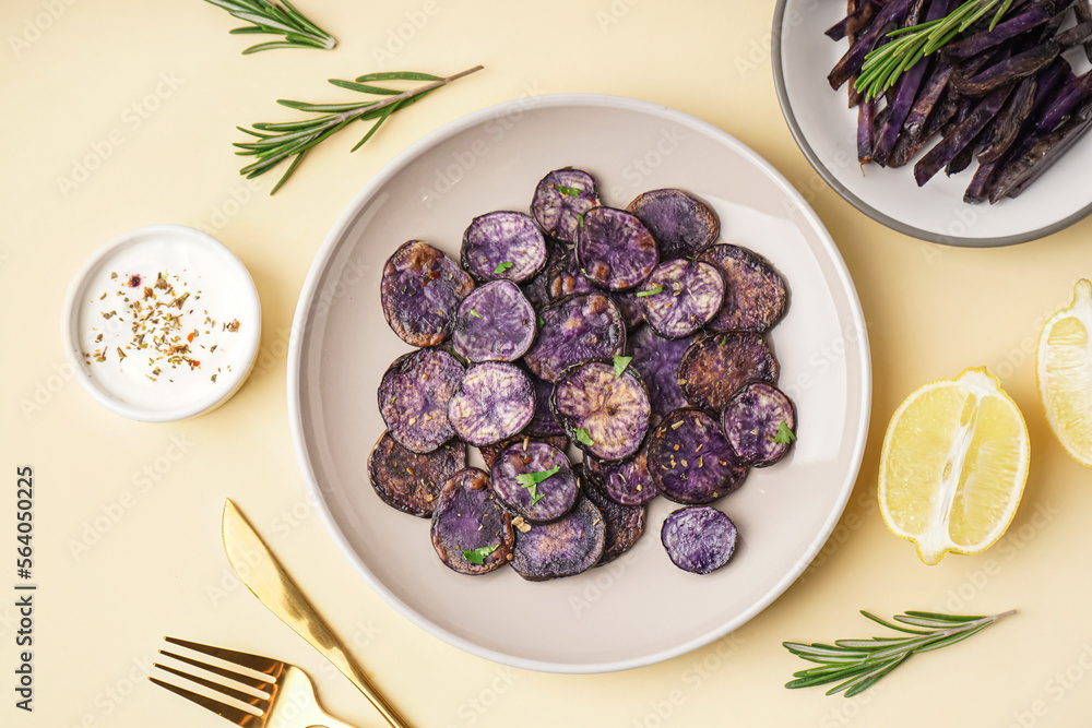Plate with fried purple potatoes, sauce and lemon on color background