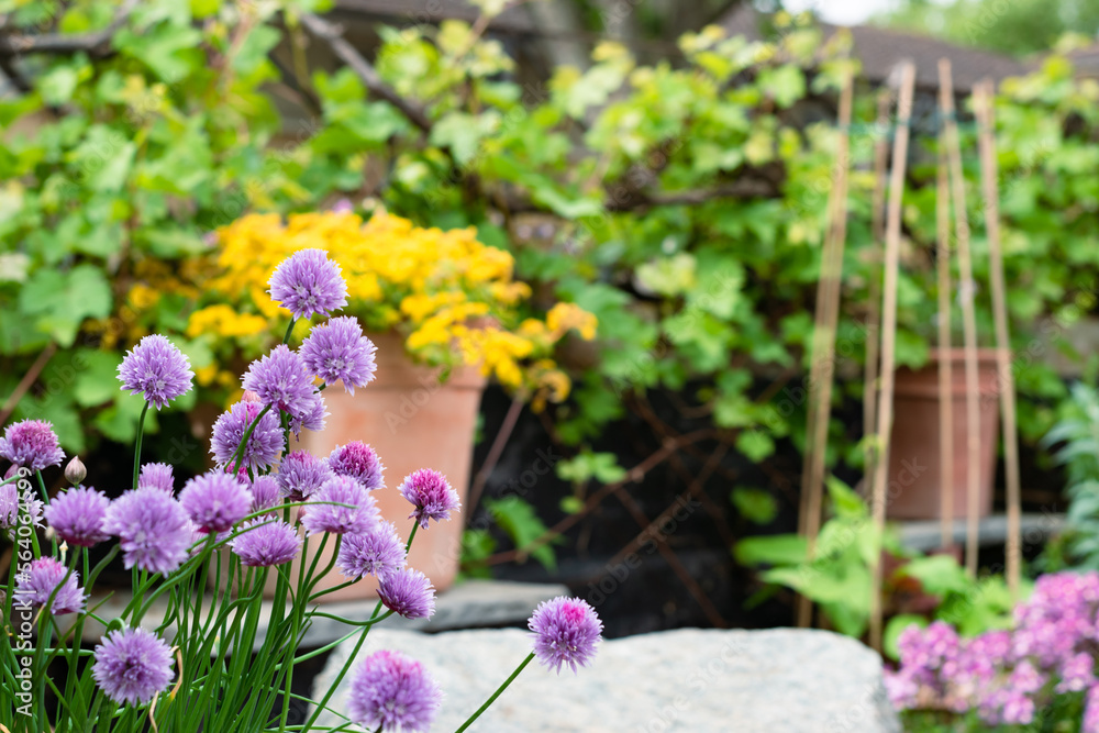 Purple flowers of chives, scientific name Allium schoenoprasum blooms in the garden with copy space for text. Selective focus shallow DOF