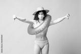young dissatisfied brunette girl in a blue swimsuit with a swimming inflatable ring puts on a medical mask