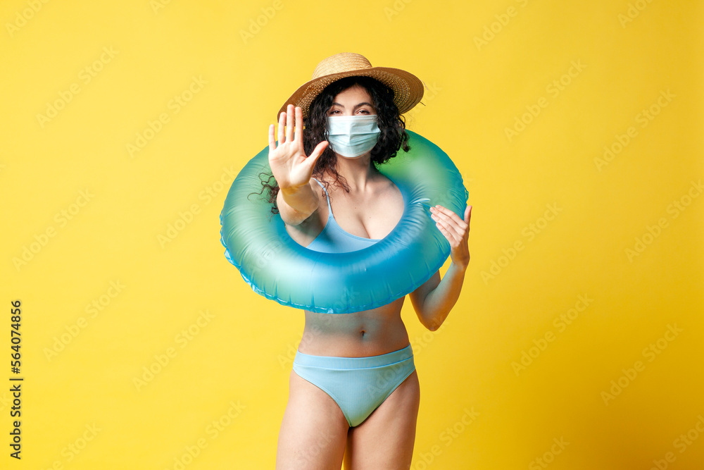 young brunette girl in a blue swimsuit with a swimming inflatable ring puts on a medical mask