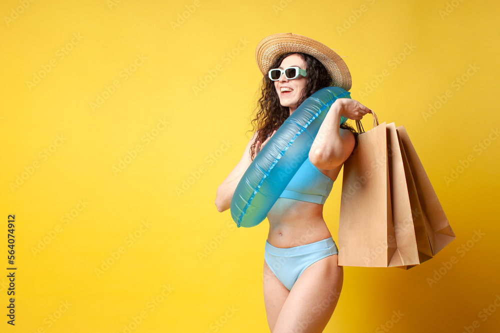 young attractive brunette girl in a blue swimsuit with a swimming inflatable ring holds packages with purchases