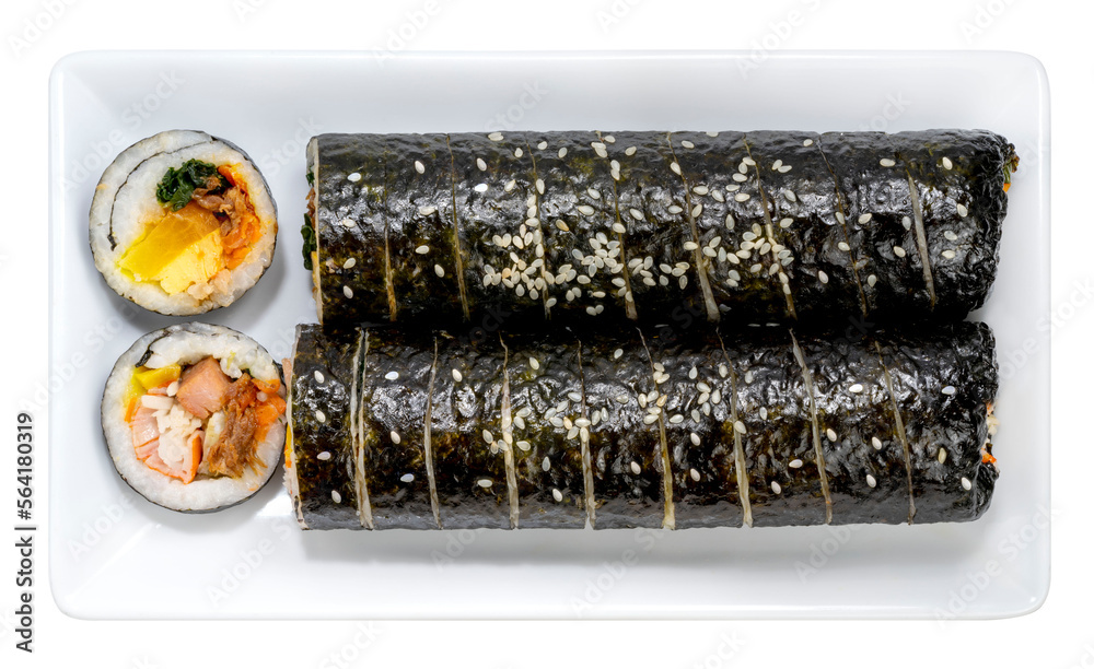 Korean Sushi Rolls or Kimbap on white background, California Maki, Steamed rice wrapped in seaweed with shrimp eggs meat and vegetable on White PNG file.