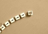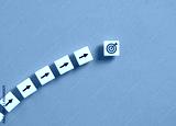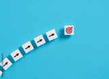 Goal achievement and strategic business planning. Moving towards the objectives. Arrow and target goal symbols on white blocks on blue background.