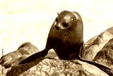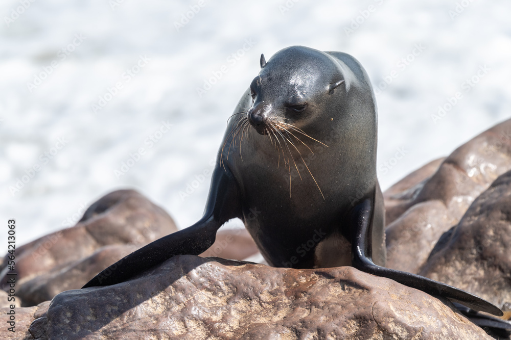 One fur seal emerging from the water along the rocky coast of the cape cross seal colony in Namibia.