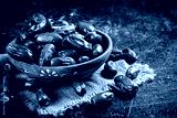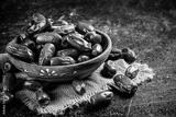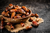 Full wooden plate with dates on the table.